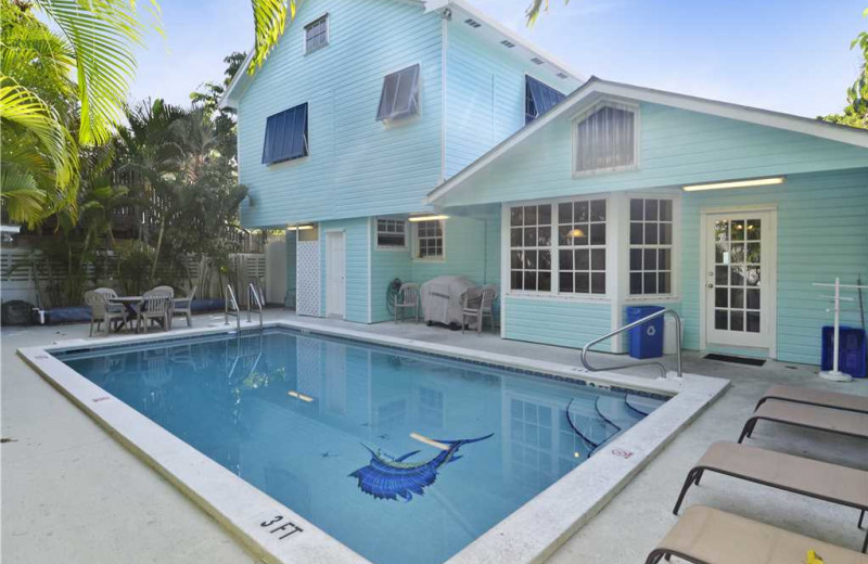 Casa Grande was built for hosting large gatherings of family and friends. A private home with an abundance of space for everyone to relax in privacy or gather for food and fun. A wide open floor plan encompasses the spacious living room (with 50" flat screen) and gourmet kitchen to the magnificent pool, one of the largest private pools on the island. Lounge, dine or BBQ -- you'll spend most of your time on this wholly private back deck space, complete with half bath and outdoor shower. The master bedroom with bath ensuite shares the first floor along with an Au Pair suite -- queen bed with bath ensuite and mini-kitchen. The laundry room is equipped with 2 sets of washer/dryers to ensure a clean supply of shorts, T's and swimsuits. Ascend the stairs to 3 bedrooms (king and 2 queens), 2 with bath ensuite and all with flat screen TVs and DVD players. One queen-bed room has a trundle bed for more flexible sleeping accommodations. Casa Grande offers one of the best locations in Key West. Less than one block off Duval Street you will be able to stroll or bike to all the best the island has to offer. Entertainment, dining, shopping or simply enjoy the culture along with tropical drinks and music. Another few blocks and you are beach side where island adventure abounds with snorkeling and sunning. You can't help but enjoy the history of the island from this ideal location.