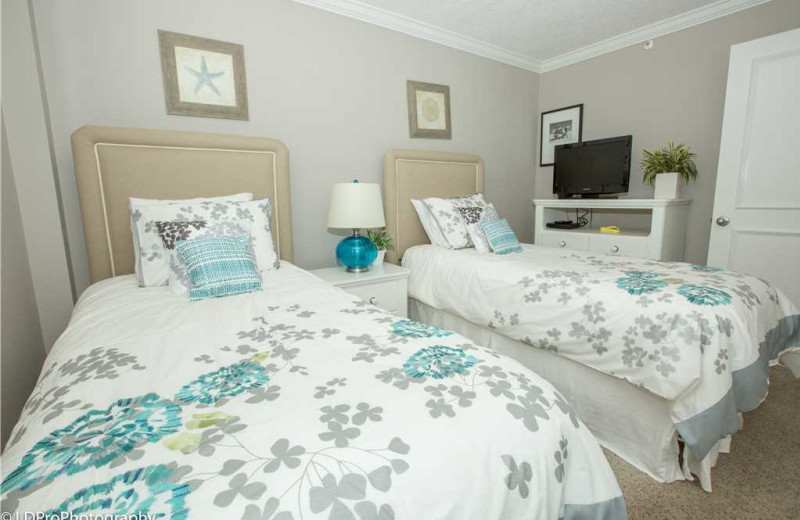 2 bedroom, 2 bath, sleeps 6, has a king in the master, 2 twins in the guest bedroom and living has a sleeper sofa