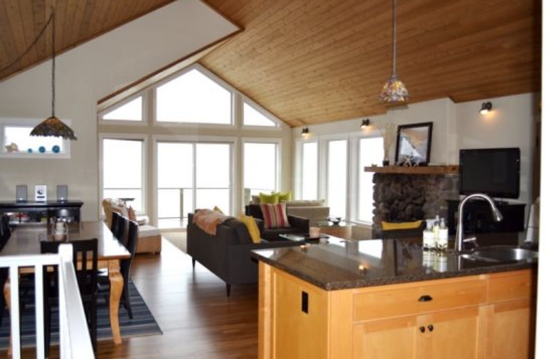 Colorful paintings in the foyer welcome you to this relaxing getaway. Your eyes quickly span the vaulted pinewood ceiling to the large windows that line the north and west walls. The view of the ocean is breathtaking and draws you closer.